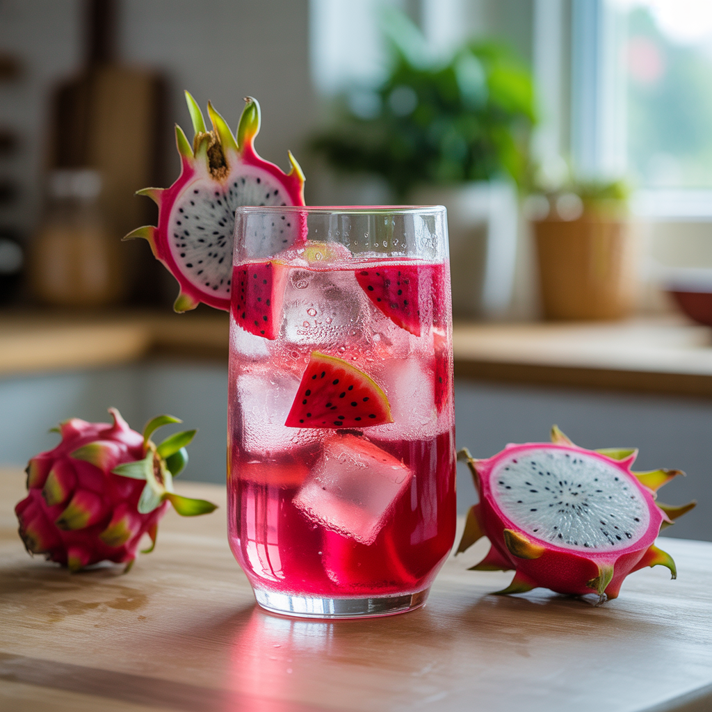 Serve in tall clear glasses to highlight that bold pink hue. Add fresh strawberry slices or a few extra dragonfruit cubes on top for a polished, café-style presentation.