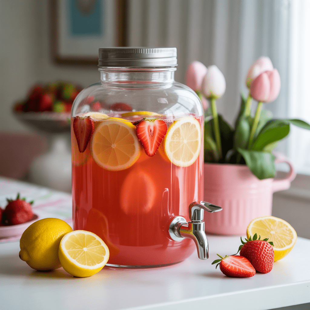 Inspired by elegant garden brunch styling, this setup blends fresh spring flavors with effortless self-serve convenience — so guests can pour, mingle, and refill without interrupting the flow of the party.