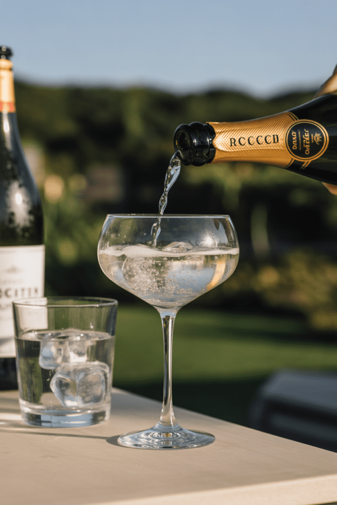 Pour in the gin, followed by the elderflower liqueur. The scent that rises immediately is soft and floral, almost garden-like. Add prosecco next, watching the bubbles bloom through the glass, then finish with a splash of soda water to keep everything light and crisp.