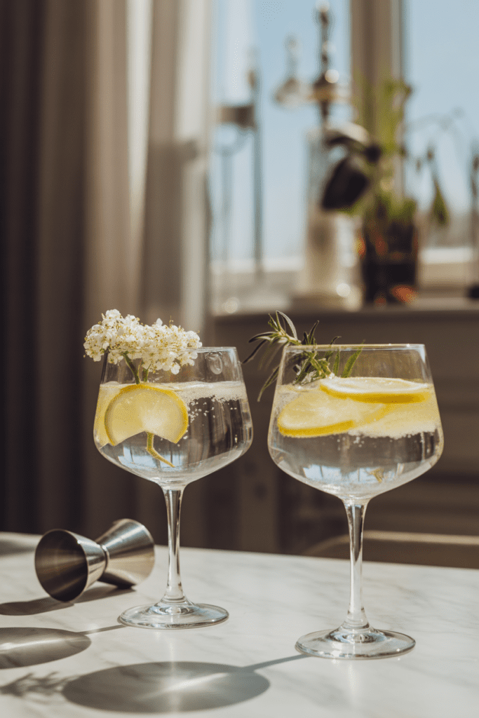 A floral or citrus-forward gin works best here. Elderflower liqueur adds softness and aroma rather than overpowering sweetness, which is what makes this cocktail feel so clean and drinkable.