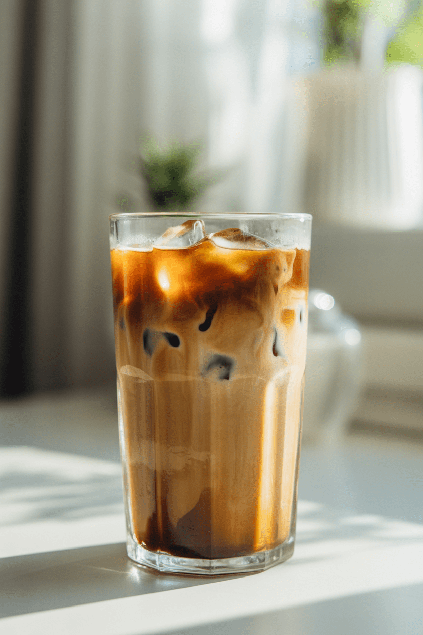 Add milk or cream slowly, watching the color swirl and soften. Sweeten to taste, stir once or twice, and take a moment before the first sip. The coffee should taste smooth and balanced, with no harsh bite — just clean, cold refreshment.